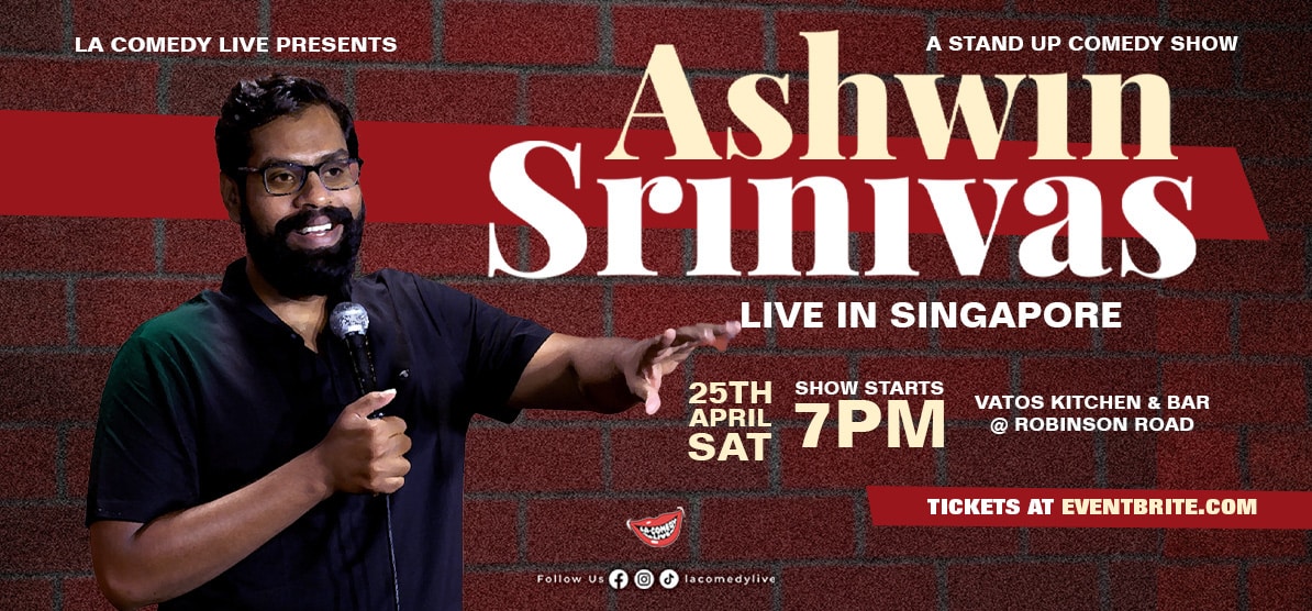 India’s comedy sensation Ashwin Srinivas brings his hit comedy set to Singapore on Saturday, April 25, 2026 at Vatos Kitchen & Bar. Get ready for a night of sharp, relatable, and effortlessly funny stand-up!